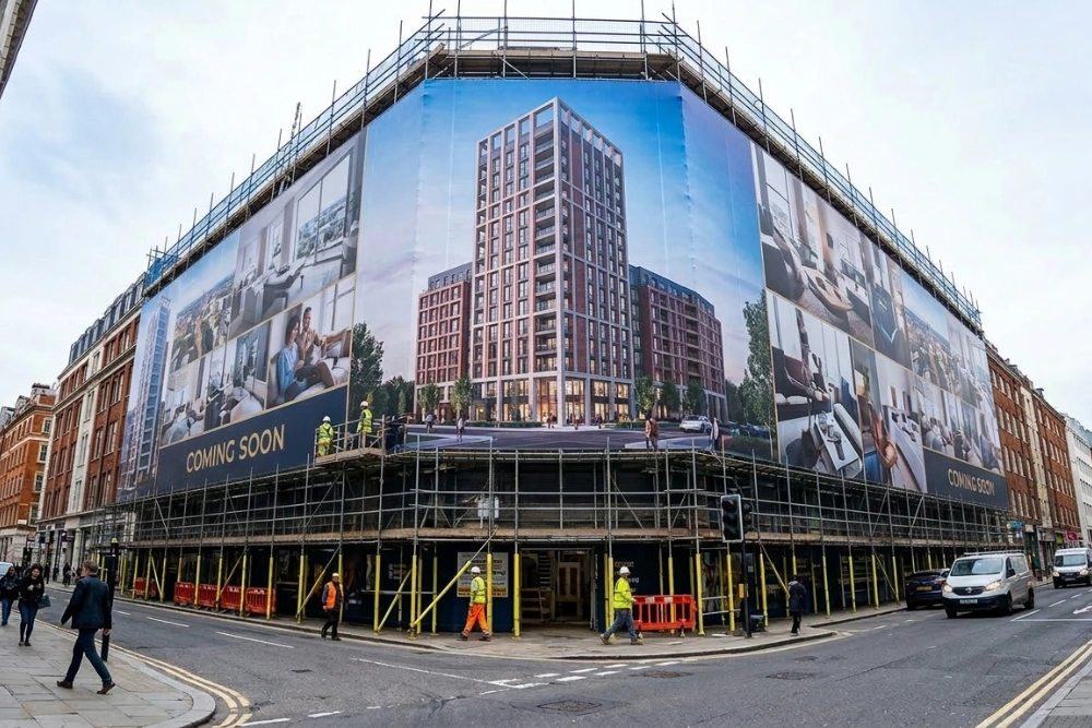 Printed building wraps can be installed across a variety of structures depending on the building layout and project requirements. The most common installation method involves fixing printed mesh graphics directly to scaffold frameworks.