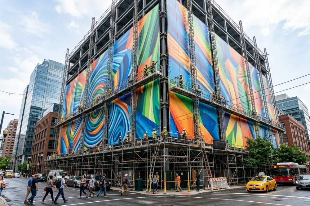 Building wraps are produced using advanced large-format printing technology that allows high-resolution graphics to be scaled across entire building façades. These printed graphics can cover scaffolding, building elevations, or temporary structures to create a seamless visual surface.